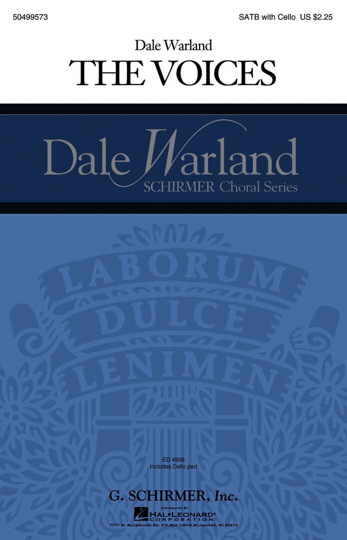 The Voices was presented to Dale Warland on the occasion of his final concert with the Dale Warland Singers by his friend, the poet Michael Dennis Browne. Dale writes, “The art of choral singing has given my life great meaning and I hope to express that fulfillment through this music for mixed chorus and solo cello.” The cello plays a leading role in the work, composed for a 2013 commission consortium of 23 choirs as a gift to Chorus America.